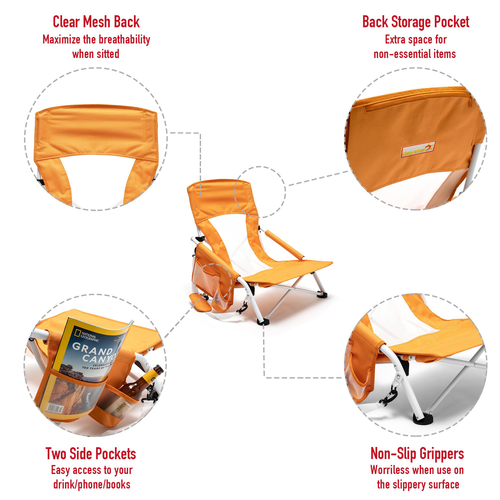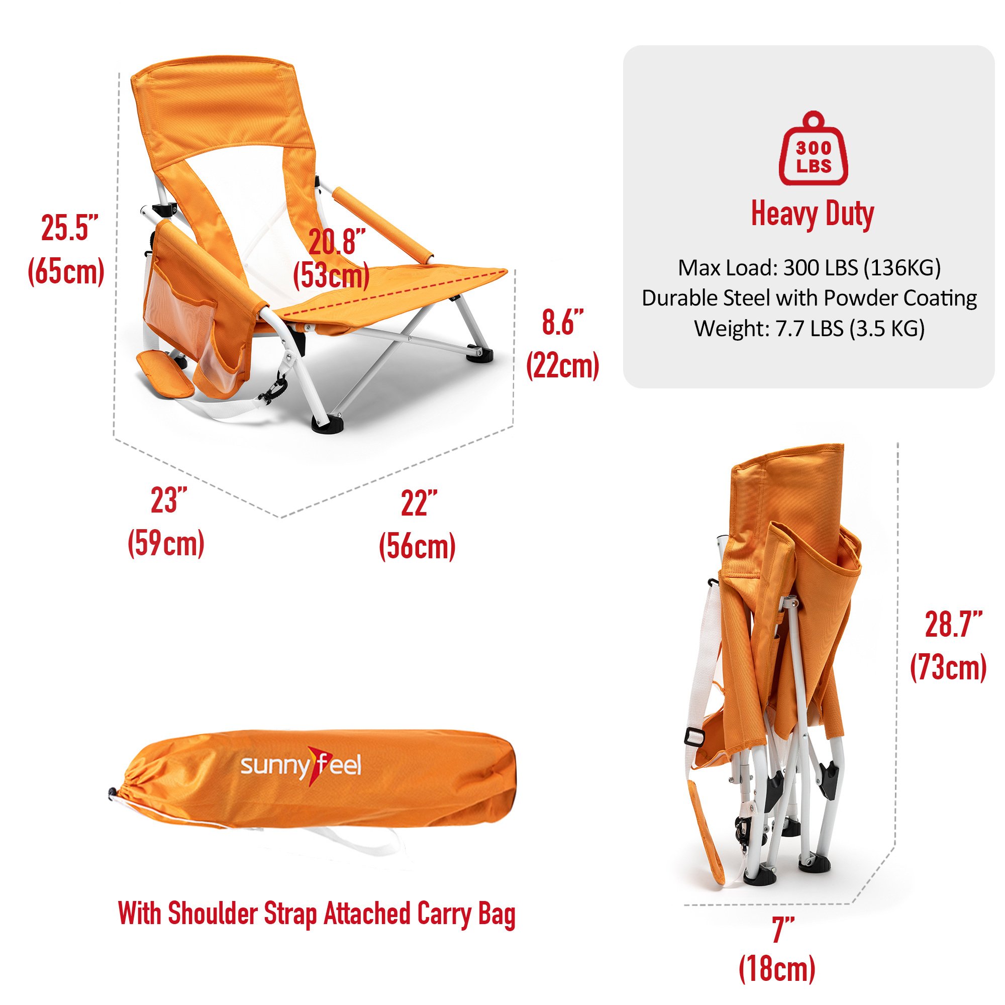 Extremely Comfy & Space Saving: The low seat beach chair seat & anti-sink leg cap & armrest design provide you an ultimate soft seating experience.The breathable and cooling mesh back design makes sitting for long comfortable for you. The small folding size (29×7.5×7 inches) saves your room while not on duty.