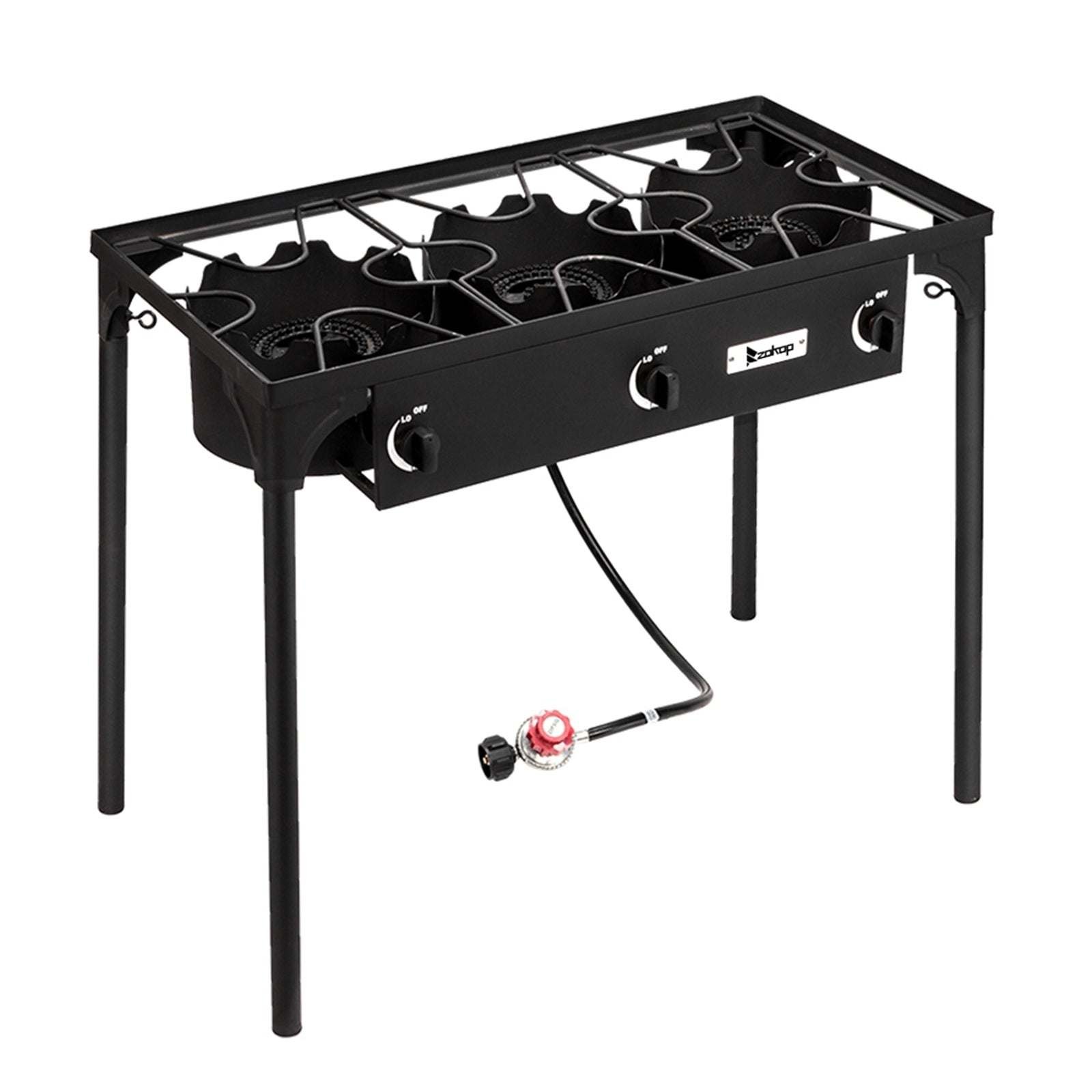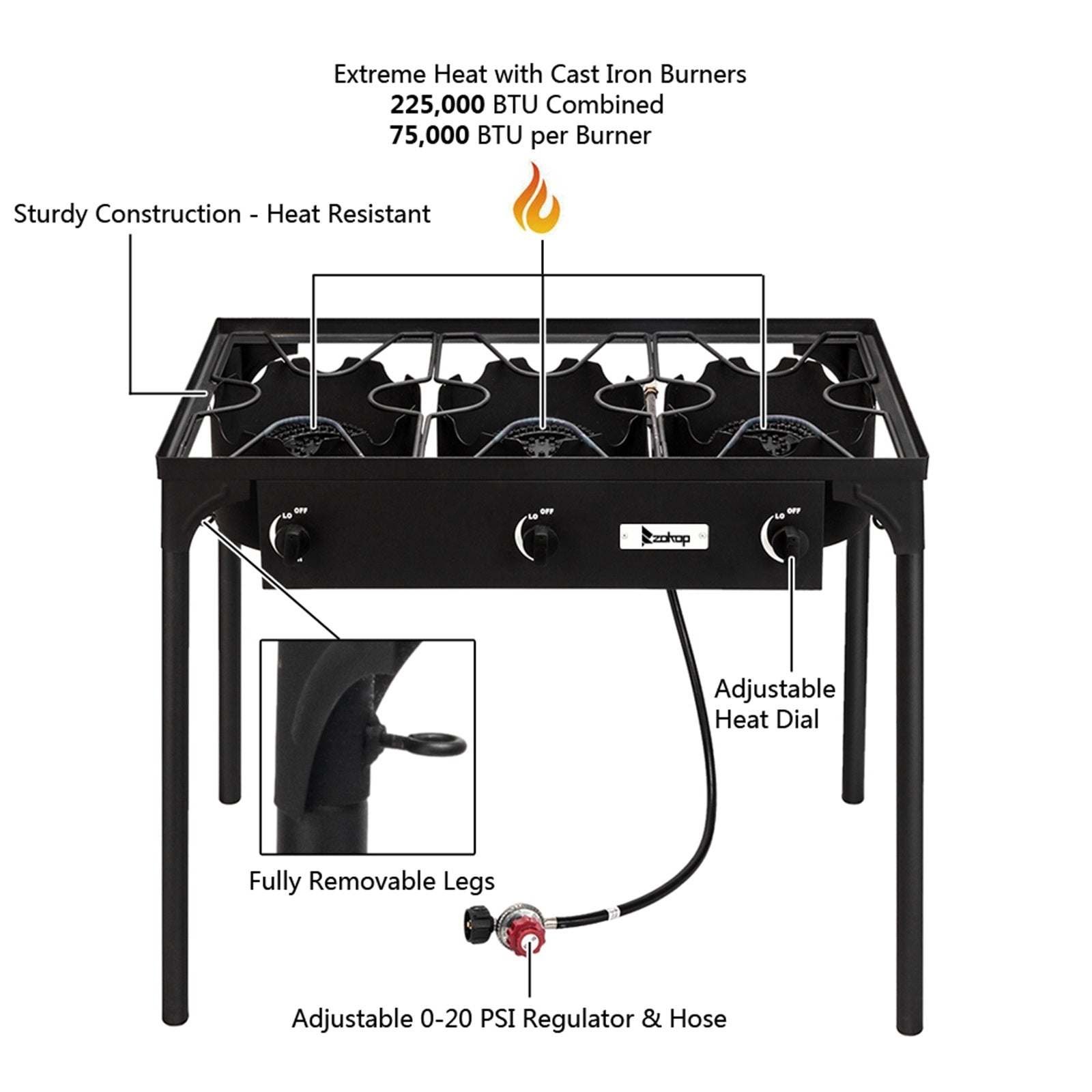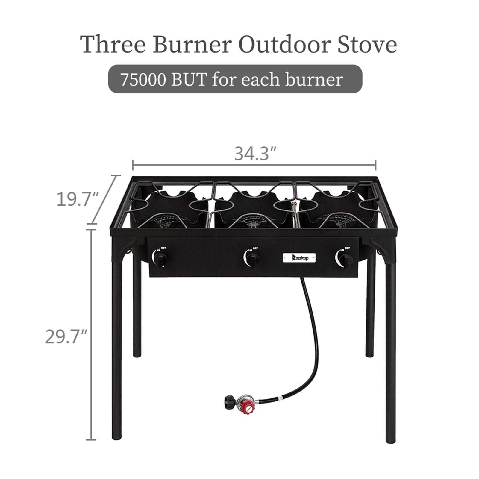 Ultra-portable with removable legsDetailsIntroductions:This powerful three burner, equipped with a cast iron head, outputs a whopping BTU of 225000. And it can adjust the firepower to make your cook more delicious. It is suitable for various types of pot because of burner bracket. So you can enjoy cooking outdoor with your family to have a happy time. Do not hesitate, just buy it.Features:1. High-pressure three burner camp stove, sturdy and durable design, made of cast iron long lasting and good for projects2. 225000 BTU of cooking power3. Ultra-portable with removable legs4. CSA listed regulator certified by CSA5. 0-20 psi adjustable make cook faster and cleaner than other standard propane burners6. Perfect for camping, fishing, parties, tailgates hunting and home brewingSpecifications:1. Product Type: Three Burner2. Material: Cast Iron3. Burner Diamter: 10.24" / 26cm4. BTU: 2250005. Brand: ZOKOP6. Furnace Head Diameter: 5.51" / 14cm7. 1.2m Leather Tube Included: Yes8. Dimensions: (34.25 x 17.72 x 29.72)" / (87 x 45 x 75.5)cm (L x W x H)Package Includes:1 x Three Burner Stove1 x 0-20 Psi Regulator1 x Instruction
