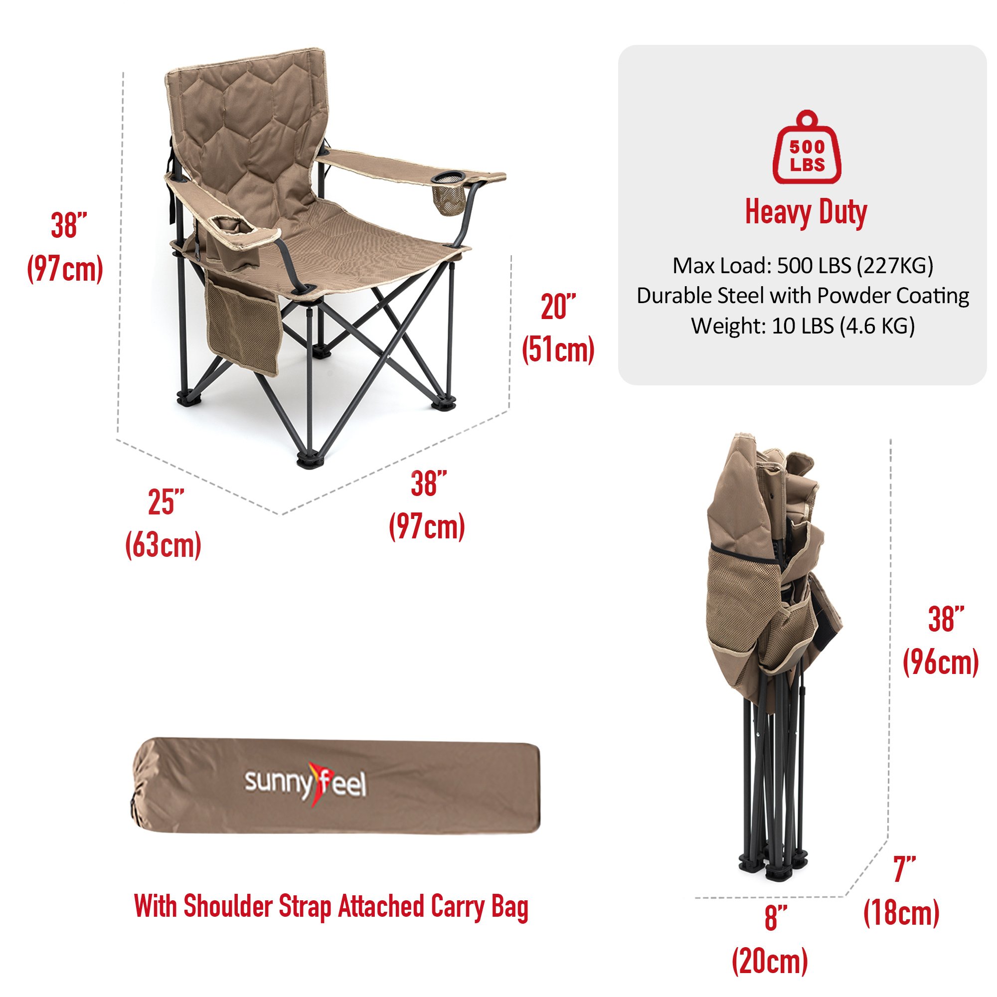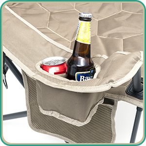 Super Handy: COOLER BAG & CUP HOLDER Keep your beverages cool in this built-in cooler bag(3 cans of cokes capacity). A convenient cup holder is built in to the left arm. The fabric is made from a durable outdoor-quality 600D oxford polyester.Built to Last: The sturdy steel frame construction affords up to 300 LBS (136KG) weight capacity and the chair weights 8.8 LBS (4KG). The double-seam 600x300D Oxford Cloth with 140g Foam Padding has great strength, durability, and breathability. You don't have to worry for the heavy-duty use, either to buy a new one in the near future.